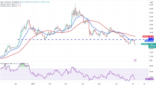 avax币价在7月3日从29美元的高点回落至25.92美元,这一转变明确显示出空头势力已将该价位转变为短期阻力位。市场随后进入调整阶段,7月5日,卖压加剧,导致币价跌破23.51美元的关键支撑位。然而,当日K线形态的长下影线透露出在较低价位有买盘介入的迹象,显示出市场对avax的潜在支撑。
