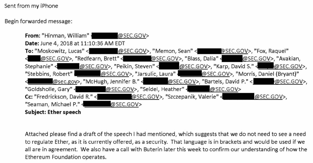 据最新公布的文件显示,Hinman曾在2018年计划与以太坊共同创办人Vitalik Buterin进行对话,已证实他认为ETH并非是证券的论述,内文如下:附上我提到的演讲草稿,这表明我们不需要像目前那样将以太币作为一种证券进行监管。本周晚些时候,我们将与Buterin通电话,来确认我们对以太坊基金会运作的理解。