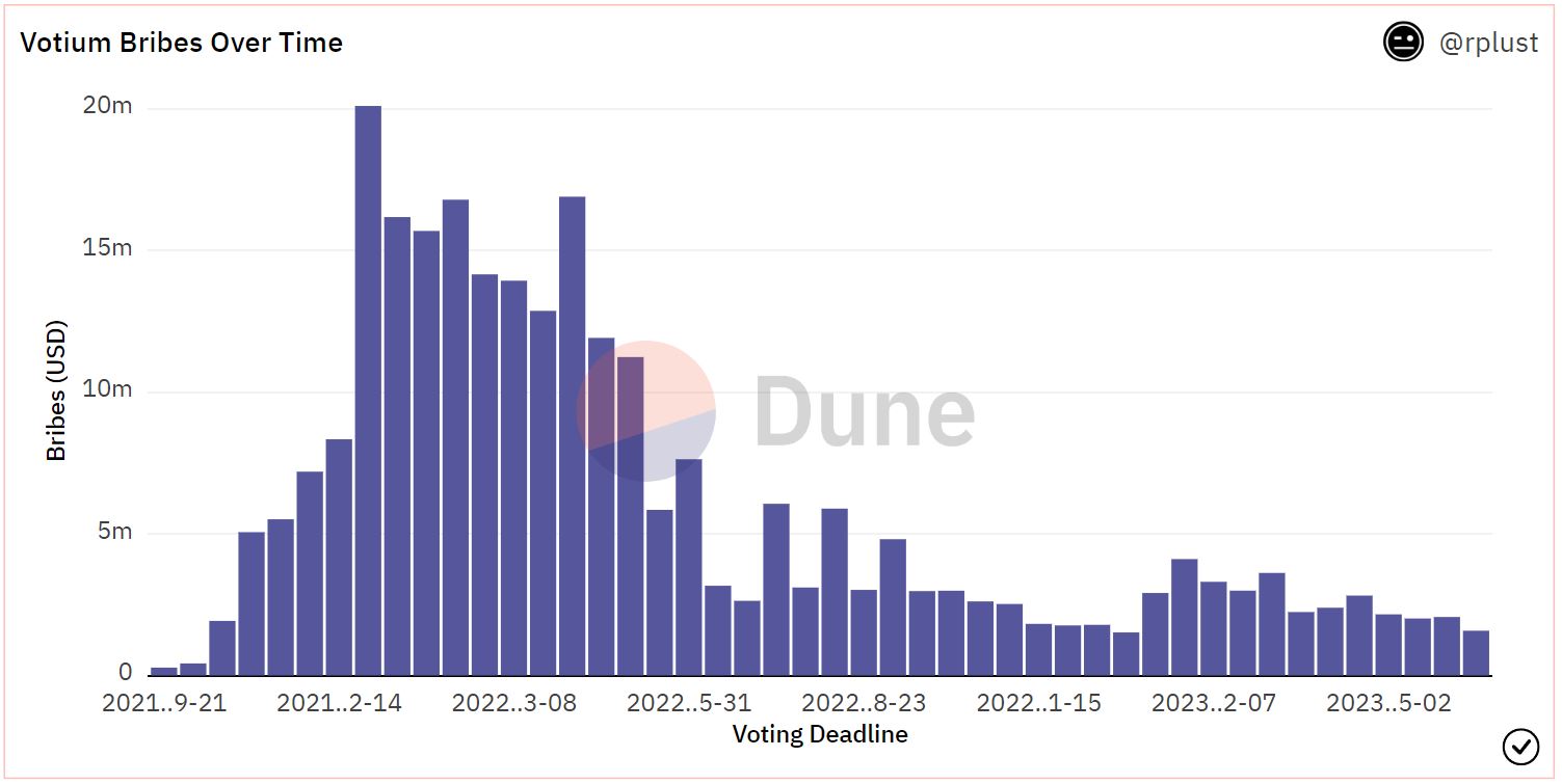 CRV 代币持有人获得价值的另一种方式是通过投票获得贿赂,将奖励直接投向特定的资金池。与交易费类似,通过贿赂获得的收入也保持在近一年低位。