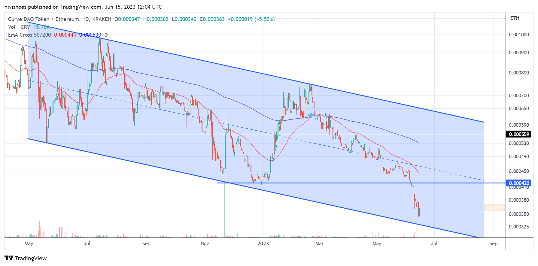 CRV/ETH 代币对看起来特别疲软,因为该货币对创下历史新低。该货币对似乎遵循下行模式,暗示有可能从 0.0032 ETH 水平反弹。