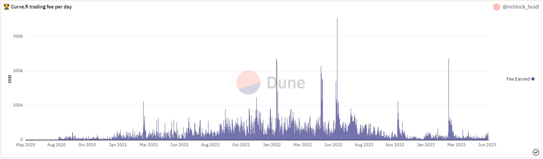 Curve 的收入统计数据也不利于买家。在 2022 年 11 月FTX 崩盘后,该平台的费用大幅下降,随着时间的推移降低了 CRV 的收益率。CRV 质押者从交易费中获得 Curve 收入的 50%。