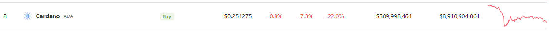 包括卡尔达诺的 ADA 在内的山寨币受到比特币低迷的重大影响。ADA 目前在CoinGecko 的定价为 0.259126 美元,仅在过去 24 小时内就下跌了 7.3%,导致 7 天大幅下跌 22%。这些数字说明了比特币价格走势与山寨币表现之间的强相关性。