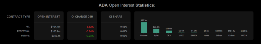 根据 Coinalyze 在四小时时间范围内提供的数据,观察到ADA 的未平仓合约 (OI)一直在减少。持仓量减少表明市场投机者对 ADA 的潜在看涨反弹缺乏热情。