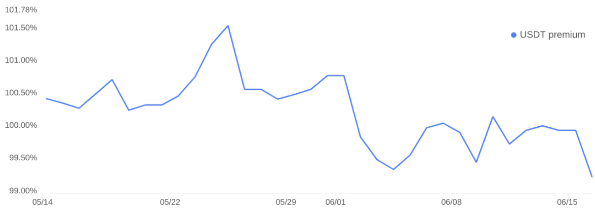 亚洲市场的 Tether 溢价自 6 月 6 日以来持平后跌至 99.2%,表明适度不适。6 月 16 日关于Tether 储备对中国债务市场敞口的报告可能是原因。