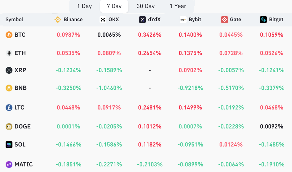 BNB 是唯一的例外,交易员每周为空头投注支付高达 1% 的费用,这可以用 Binance 交易所监管审查后增加的风险来解释。