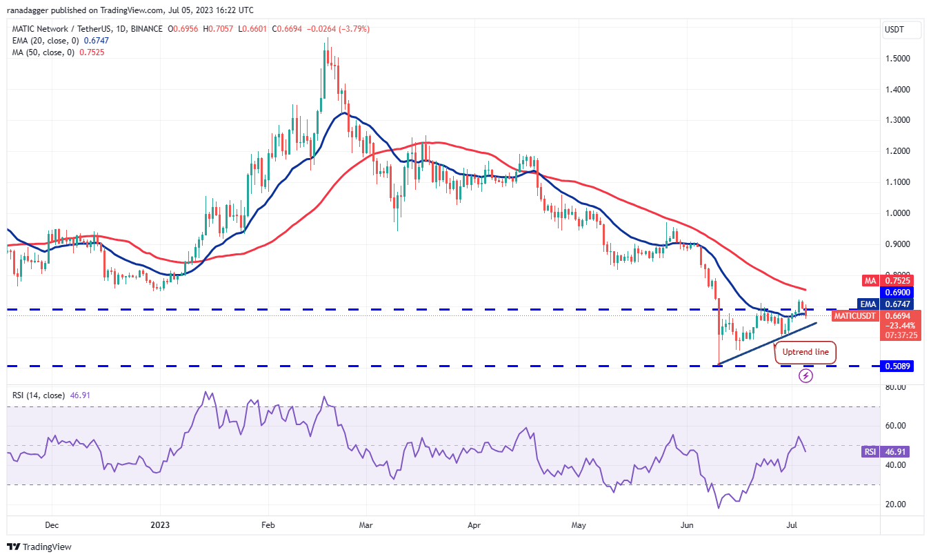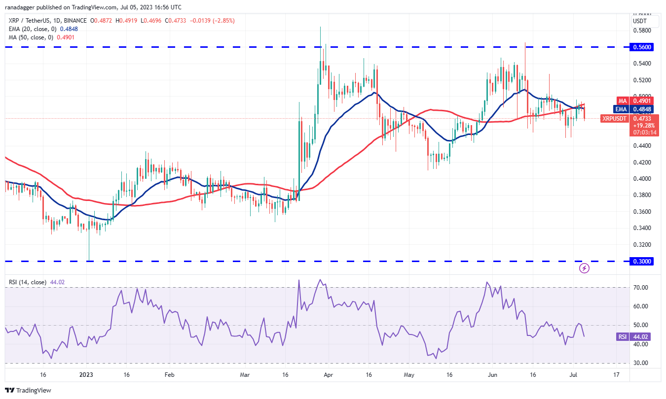 20日均线(0.07美元)已开始逐渐上行,但RSI已跌至中点,表明积极势头可能正在减弱。如果价格突破并维持在 20 日均线下方,则表明 DOGE/USDT 货币对可能会在 0.06 美元至 0.07 美元的区间内停留更长的时间。