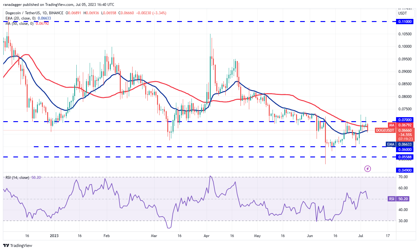 多头再次试图推动和维持狗狗币突破 7 月 4 日 0.07 美元的上方阻力位,但空头坚守阵地。