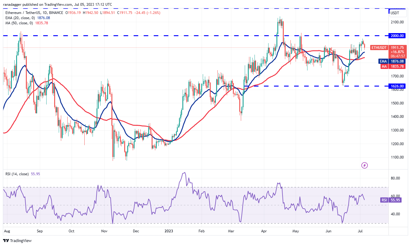 空头必须将价格下跌并维持在移动平均线以下,以表明 ETH/USDT 货币对可能会在一段时间内继续在 2,000 美元至 1,626 美元之间盘整。