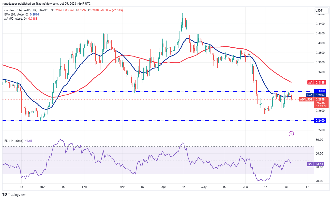 如果价格维持在 20 日均线(0.29 美元)下方,空头将试图将 ADA/USDT 货币对跌至 0.26 美元。这一举动表明该货币对可能会在几天内继续停留在 0.30 美元至 0.24 美元的区间内。