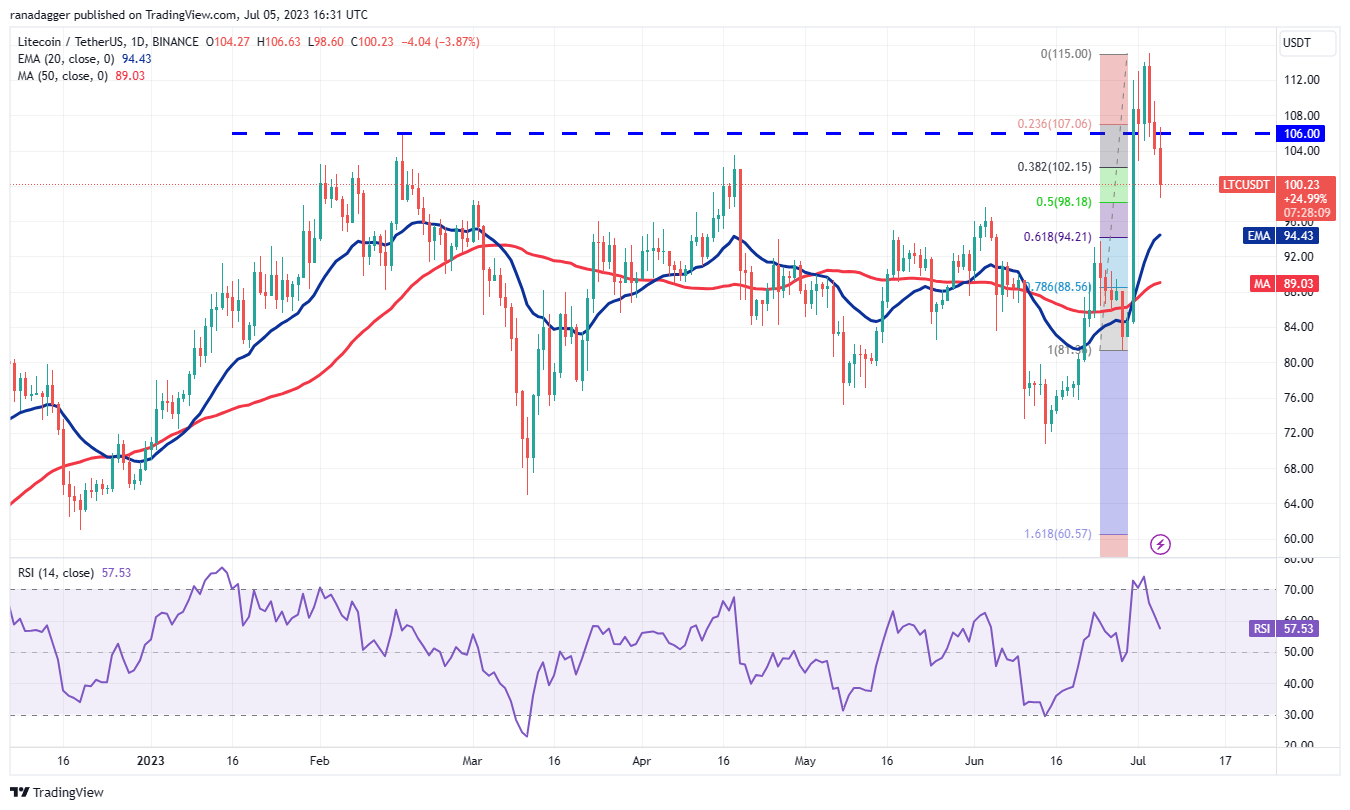 98 美元的 50% 斐波那契回撤位是值得关注的重要支撑位。从该水平的强劲反弹将是一个积极的信号,因为它将表明交易者正在逢低买入。这将增加重新测试 115 美元的可能性。如果该阻力位消失,LTC/USDT 货币对可能会恢复上涨趋势至 136 美元。