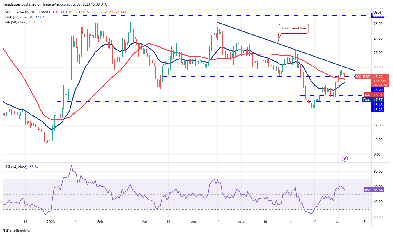 Solana 上的长灯芯7 月 4 日烛台显示空头正在大力保护该水平。对多头有利的一个小积极因素是,他们不允许价格回落至 18.70 美元的直接支撑位以下。
