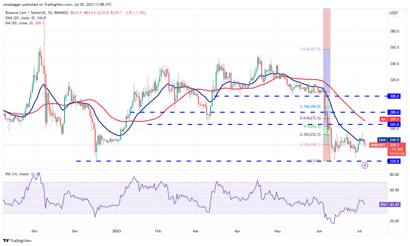 买家试图延长 BNB 的价格7 月 3 日反弹至 20 日均线(245 美元)上方,但空头在 252 美元的 38.2% 斐波那契回撤位附近大举抛售。