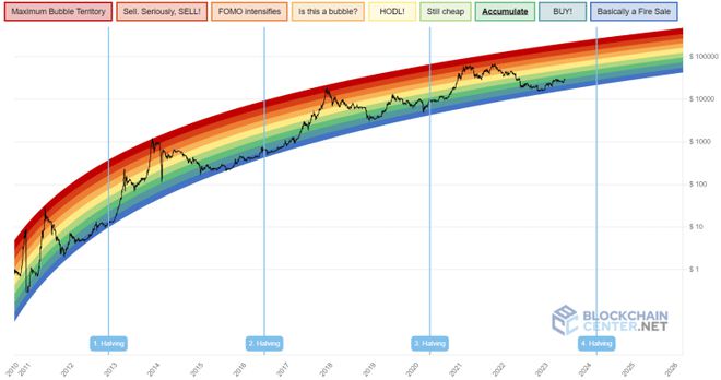 最后,Blockchaincenter.net 流行的比特币彩虹图显示,在目前的水平上,比特币处于“买入!”状态。区,最近刚刚从 2022 年底的“基本上是甩卖”区中恢复过来。