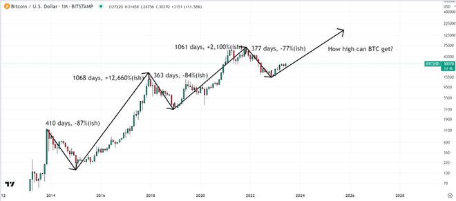 如果比特币 2021 年 11 月(历史高点左右)到 2022 年 11 月(2022 年低点左右)的熊市已经结束,那么我们现在可能会进入新的大约三年的牛市大约六个月。